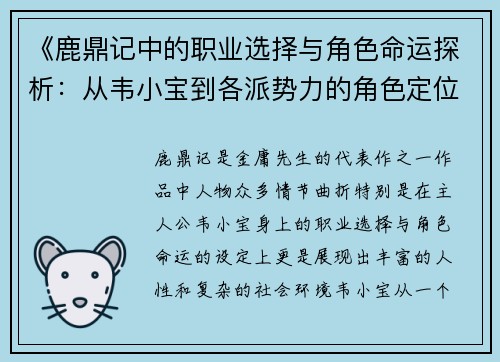 《鹿鼎记》是金庸先生的代表作之一,作品中人物众多、情节曲折,特别是在主人公韦小宝身上的职业选择与角色命运的设定上,更是展现出丰富的人性和复杂的社会环境。韦小宝从一个江湖草莽到成为满清朝廷的权力中心人物...